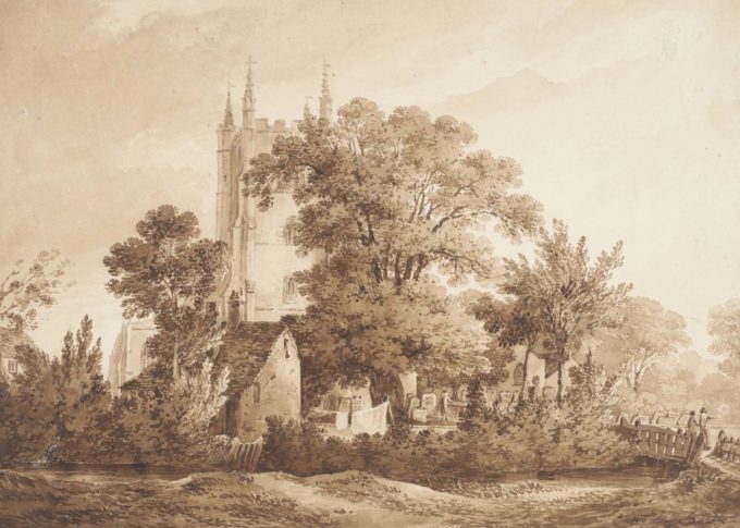Exterior view of Croydon Church, Surrey. The River Wandle flowing in the foreground. Water colour by James Biourne . This exhibition publicity image issued by the Museum of London may be published in the context of promoting or reviewing the Secret Rivers exhibition at the Museum of London Docklands, 2019.